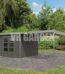 Abri de jardin en bois gris terre 28mm - acier gris poussière - 7,34m² Pluto B + appentis 300cm – Karibu
